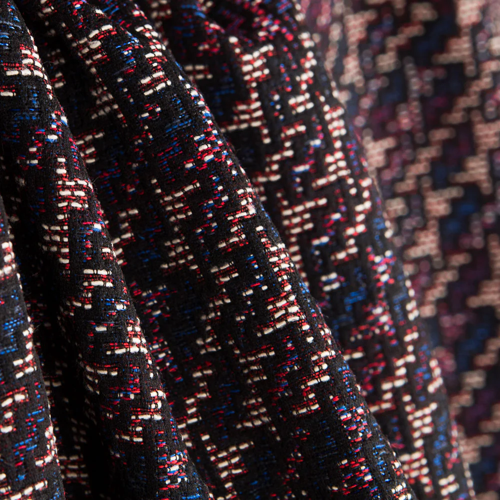 Tela de brocado zig zag fucsia. Tela fina, opaca, con poco cuerpo y cierta rigidez. Ideal para la confección de complementos, trajes, vestidos y decoración.